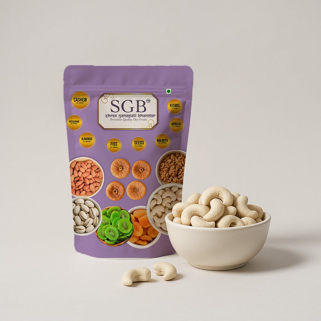 At Shree Ganpati Bhandar, we bring you top-grade W240 whole cashews, sorted for quality and packed fresh. Known for their creamy texture and premium look, they are a staple in festive dry fruit boxes and gourmet kitchens alike.