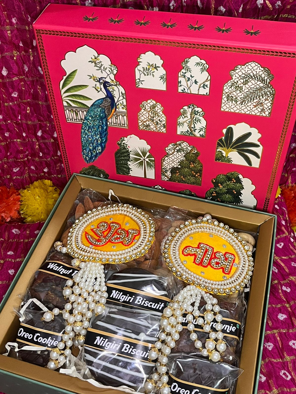 Peacock Printed Box, Dryfruits (100gm each), Shubh Labh pair, Brownie 2, Nilgiri 2, Oreo Cookie 2