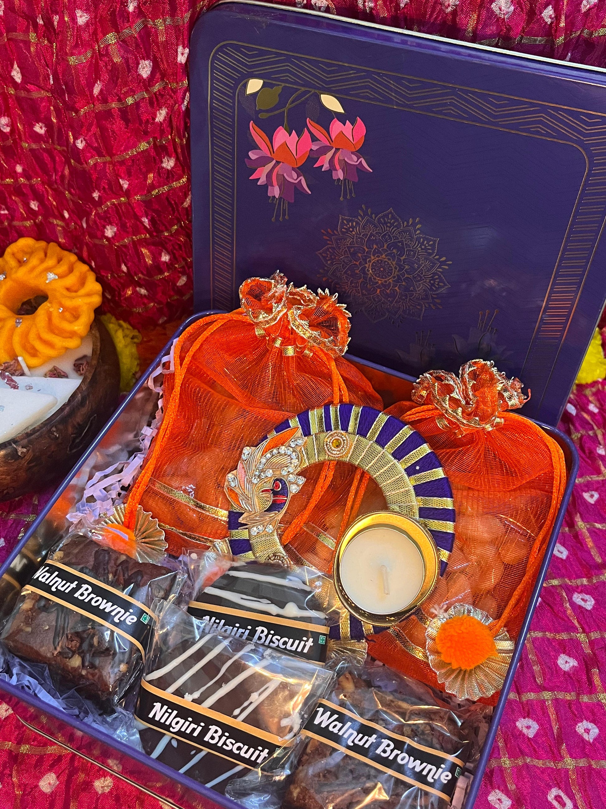 Floral Tin Box, Brownie 2, Nilgiri 2, Dryfruits (100gm each), TLight