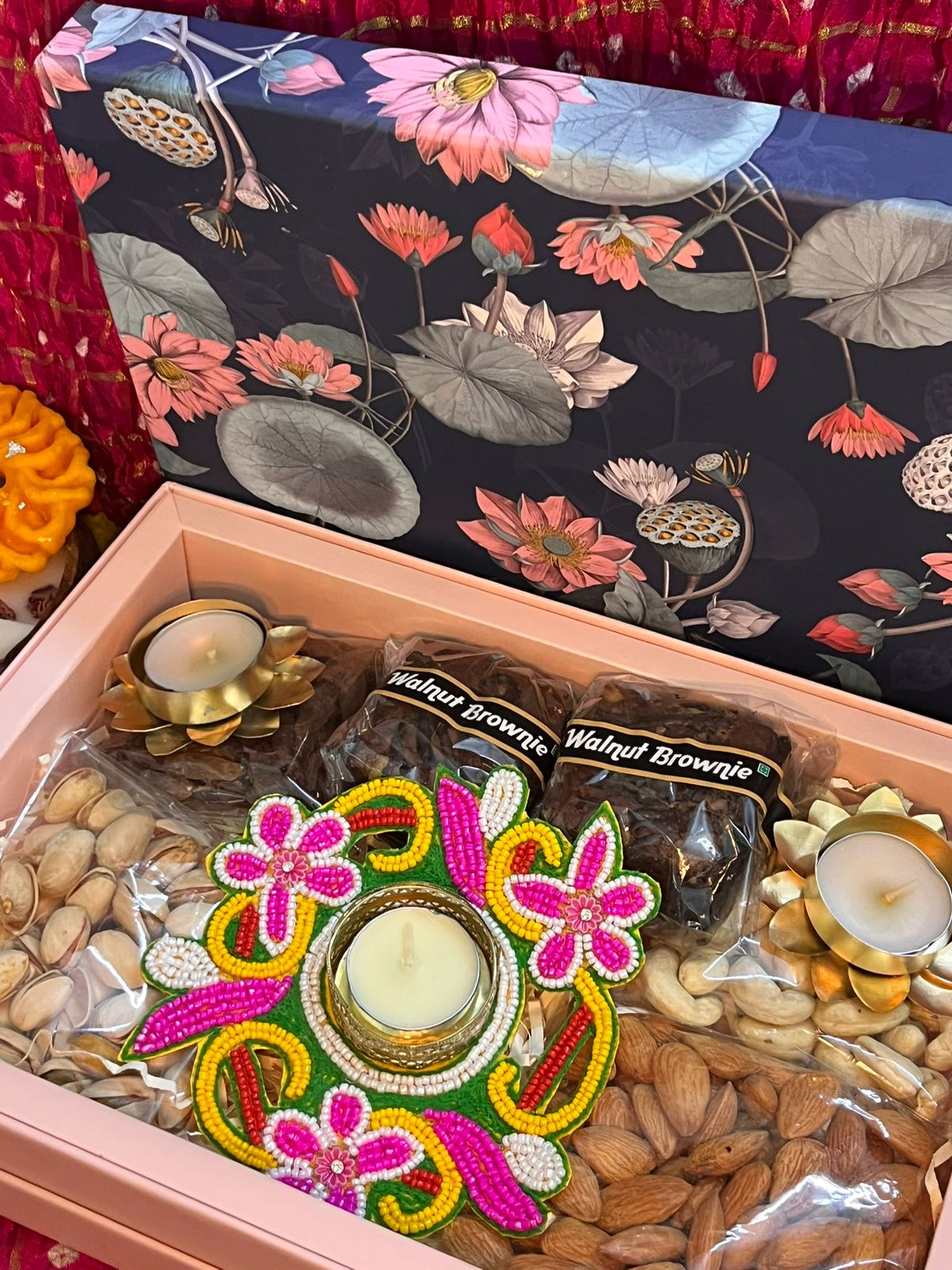 Floral Printed Box 4, Dryfruits (100gm each) 2, Metal Tlight, Decorative Tlight, Brownie 2
